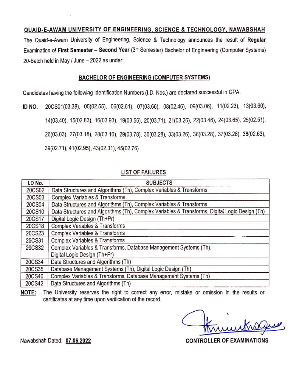 QUEST Bachelor of Engineering result 2022