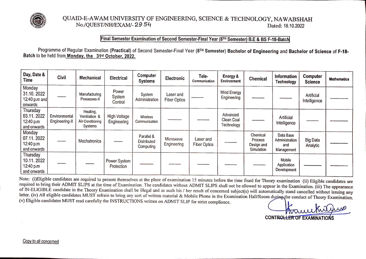 Quaid e Awam University of Engineering, Science and Technology has already receive admission form from the student to manage their Bachelor of Engineering and Bachelor of Sciences practical examination 2022. The exam section of QUEST has announced to take BE and BS 2nd semester and final Year 8th semester examination from candidates. The students, who want to appear in their bachelor degree annual exams, they can note their final Semester Exams 2022 Schedule, which is mentioned online and students can follow them at the time of appearing in their exams. According to QUEST annual Exam will be started from Oct 31, 2022. Student can download date sheet from University official web site.