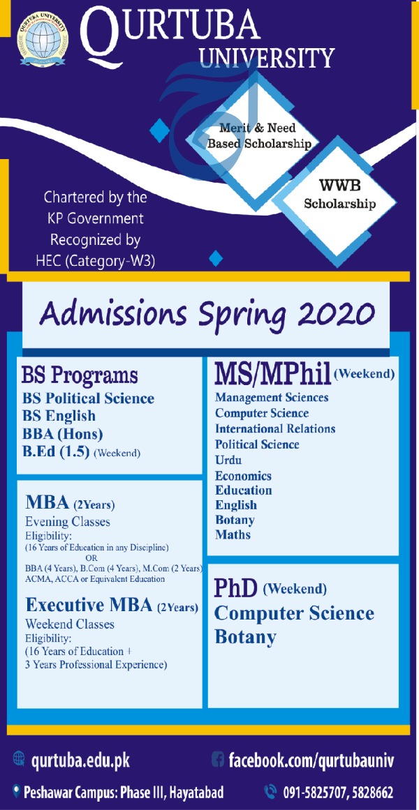 Qurtaba University BS MBA MS Mphil PHD Admission 2020