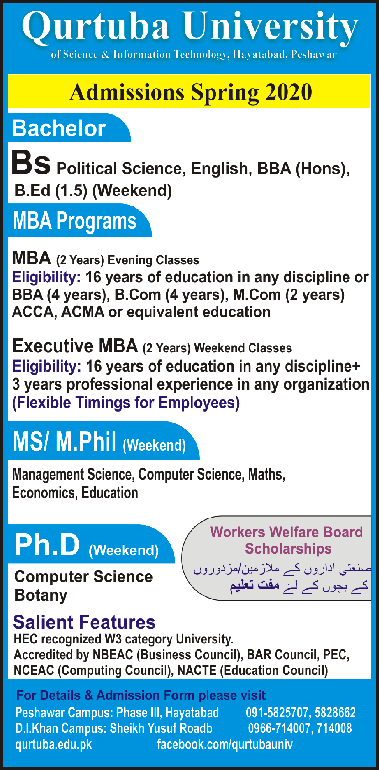 Qurtaba University Admission 2020 announced for the class of BS political Science, English, BBA hons, b.Ed 1.5 weekend, MBA 2 years evening Classes, Executive MBA 2 years Weekend Classes, MS, M.Phil management science, Computer Science, Maths, Economics, Education, Ph.D Computer science botany.