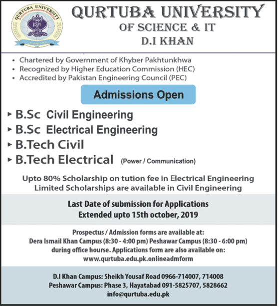 Qurtuba University of Science & IT has announced admissions in B.Sc Civil Engineering, B.Sc Electrical Engineering, B.Tech Civil, B.Tech Electrical in Dera Ismail Khan.
