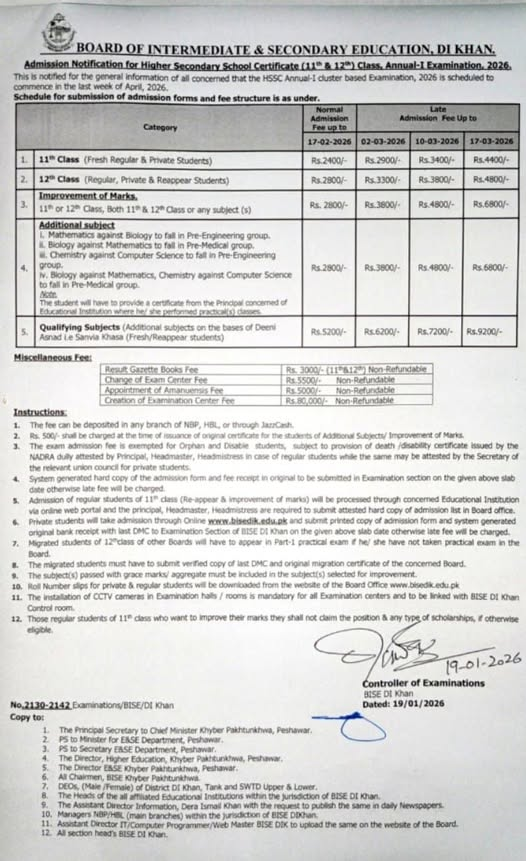 Board of Intermediate and Secondary Education, DI Khan has issued an official notification regarding admissions for the Higher Secondary School Certificate Classes 11 and 12 Annual-I Exams 2026. This notice is shared for the information of all concerned students and institutions. According to the board, the HSSC Annual-I exams are expected to commence in April 2026, and students must submit their admission forms according to the revised schedule announced by the board. The students can get the latest updates of Revised Admission Schedule for BISE DI Khan HSSC Annual-I Exams 2026.