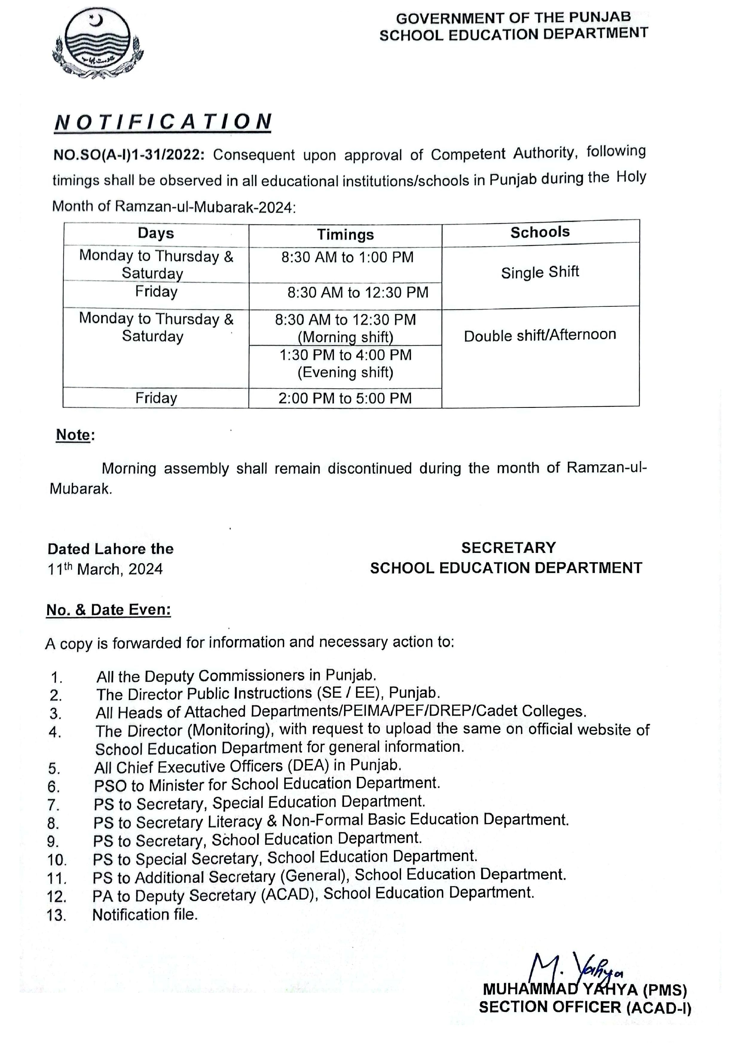As per the departments notification, single-shift schools will operate from 8:30 am to 1:00 pm on Mondays through Thursdays and on Saturdays. However, on Fridays, the timings will be from 8:30 am to 12:30 noon. For second-shift schools, classes will begin at 1:00 pm and conclude at 4:00 pm during Ramadan.