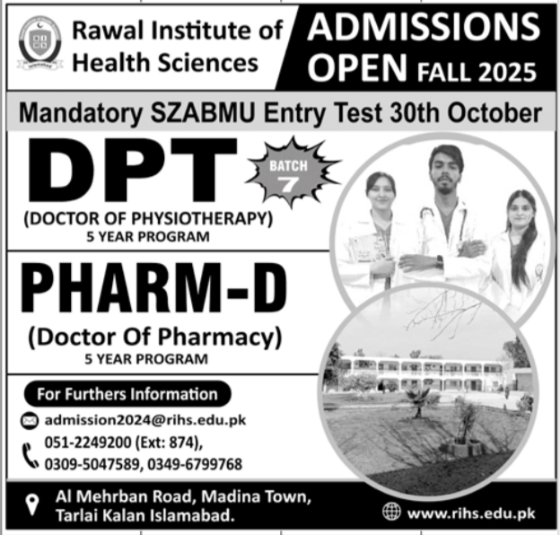 Rawal Institute of Health Sciences RIHS is pleased to announce that admissions for the Fall 2025 session are now open. Aspiring healthcare professionals are invited to apply for our prestigious programs in the field of health sciences.