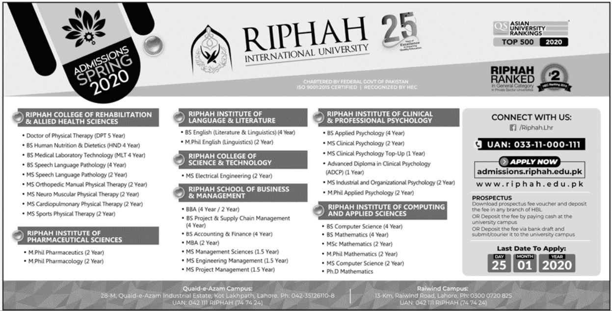 Ripah International University announced the Admission for the session of 2020. The Ripah International University has now starts the Admission in the Doctor of Physical Therapy, BS, MS, M Phil, BBA, MBA. The Last date of Admission form Submission is 25th January, 2020.