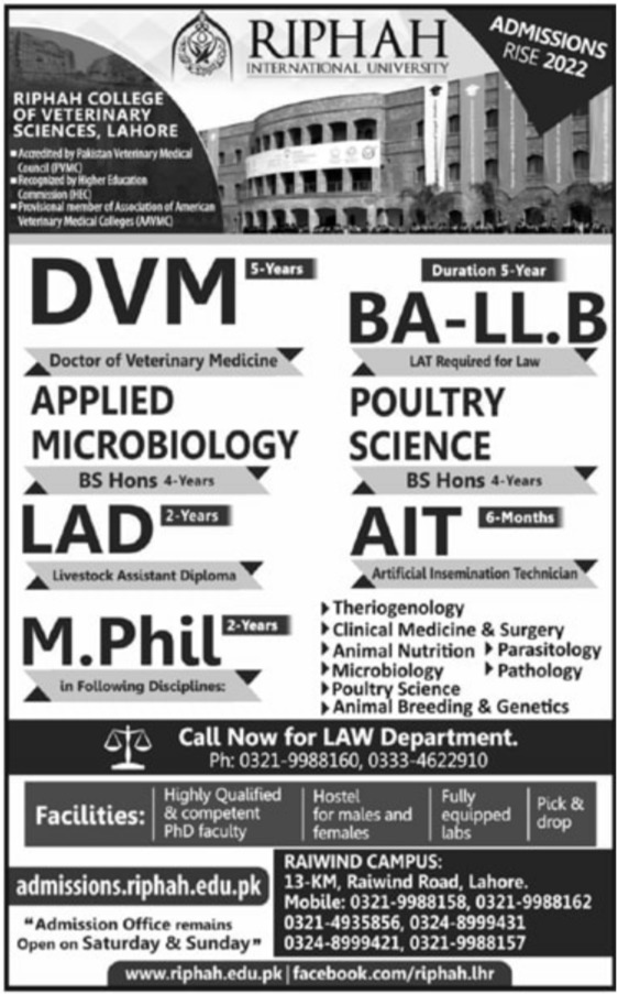 RIPHAH College of Veterinary Sciences MPhil Admission 2022 Program started in Doctor of Veterinary Medicine DVM 5 Years, Applied Microbiology BS Hons 4 Years, Livestock Assistant Diploma LAD 2 Years, MPhil in Following Discipline, BA LLB 5 Years, Poultry Science BS Hons 4 Years, Artificial Insemination Technician in Theriogenology, Clinical Medicine & Surgery, Animal Nutrition, Parasitology, Microbiology, Pathology, Poultry Science, Animal Breeding & Genetics. Admission Office remains Open on Saturday & Sunday. Interesting candidates may apply to their desired field of study.