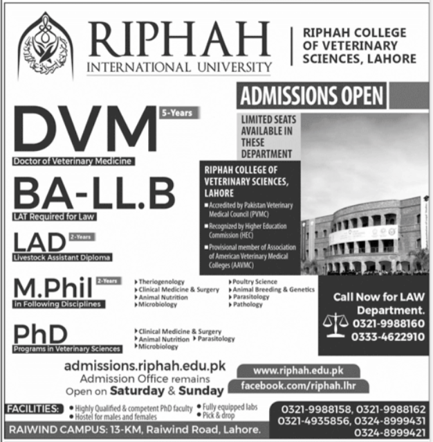 Riphah International University invites applications for its undergraduate, postgraduate, and doctoral programs at the Riphah College of Veterinary Sciences, Lahore. Known for academic excellence, modern facilities, and highly qualified faculty, Riphah provides students with quality education aligned with national and international standards.