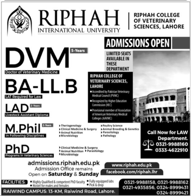 Riphah International University announces admissions for its Riphah College of Veterinary Sciences, Lahore for the upcoming academic session. With limited seats available, the college offers world-class education in veterinary sciences, law, and related disciplines, ensuring high-quality training and professional development.