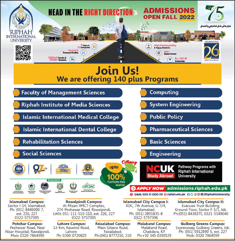 RIPHAH University of Islamabad BS Admission 2022 offers in BS Management Sciences, Medical Sciences, Islamic International, Rehabilitation Sciences, Social Sciences, Computing, System Engineering, Public Policy, Pharmaceutical Sciences, Basic Sciences, Engineering. Please also see the Paper Ad.