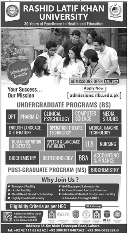 Rashid Latif Khan University RLKU is welcoming applications for Admissions 2024 Fall, offering a diverse array of undergraduate programs. Prospective students can choose from programs such as Doctor of Physical Therapy DPT, LLB, BBA Post graduate program MS , and more, tailored to meet the demands of todays competitive job market.