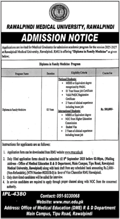 Rawalpindi Medical University RMU, one of Pakistans leading medical institutions, invites applications from qualified medical graduates for admission to its Diploma in Family Medicine program for the academic session 2025–2027.