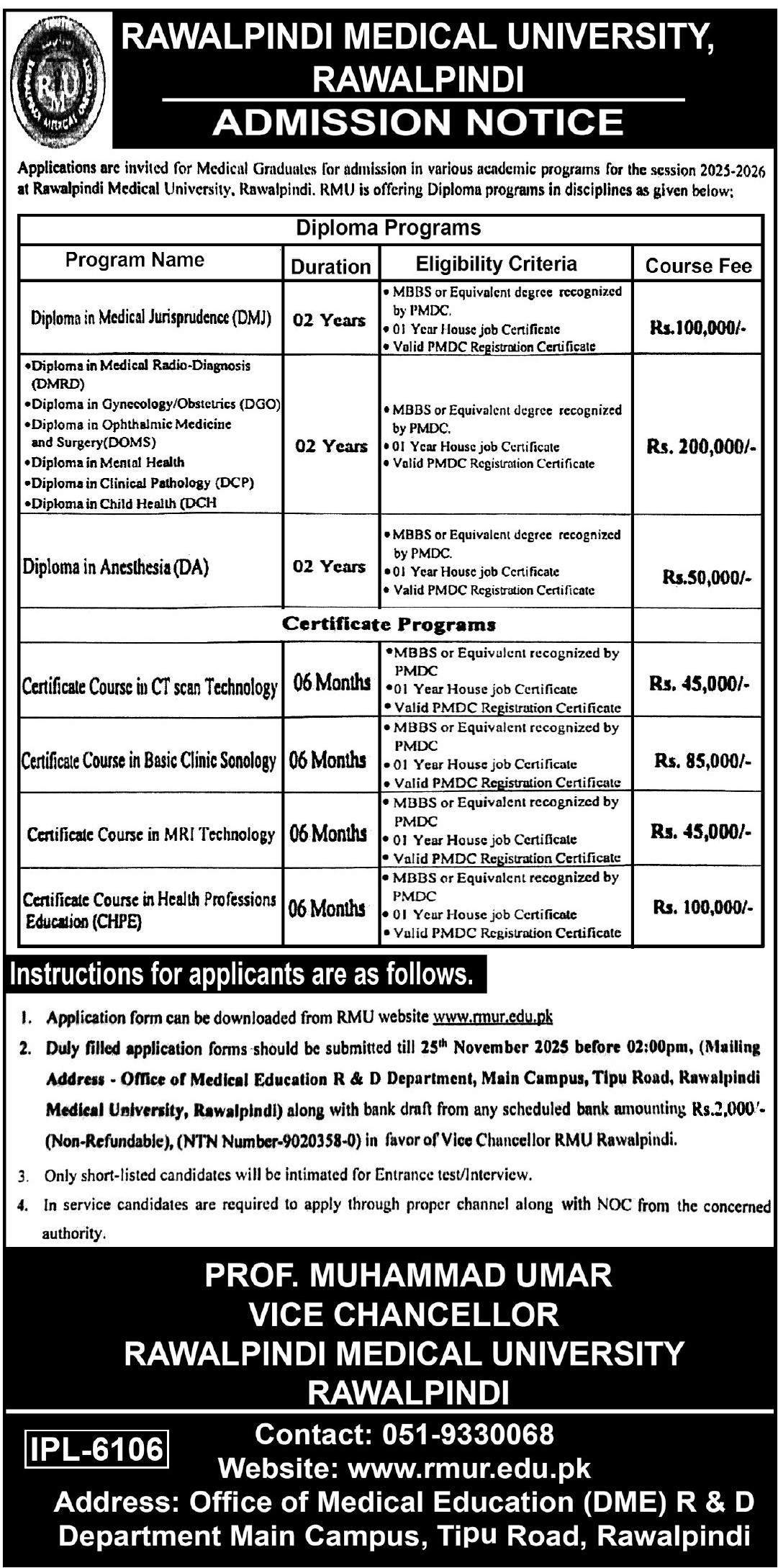 Rawalpindi Medical University RMU, Rawalpindi, a leading institution in medical education and clinical training, has opened admissions for Diploma and Certificate Programs for the academic session 2025–2026. Applications are invited from eligible medical graduates seeking advanced qualifications in specialized medical fields.