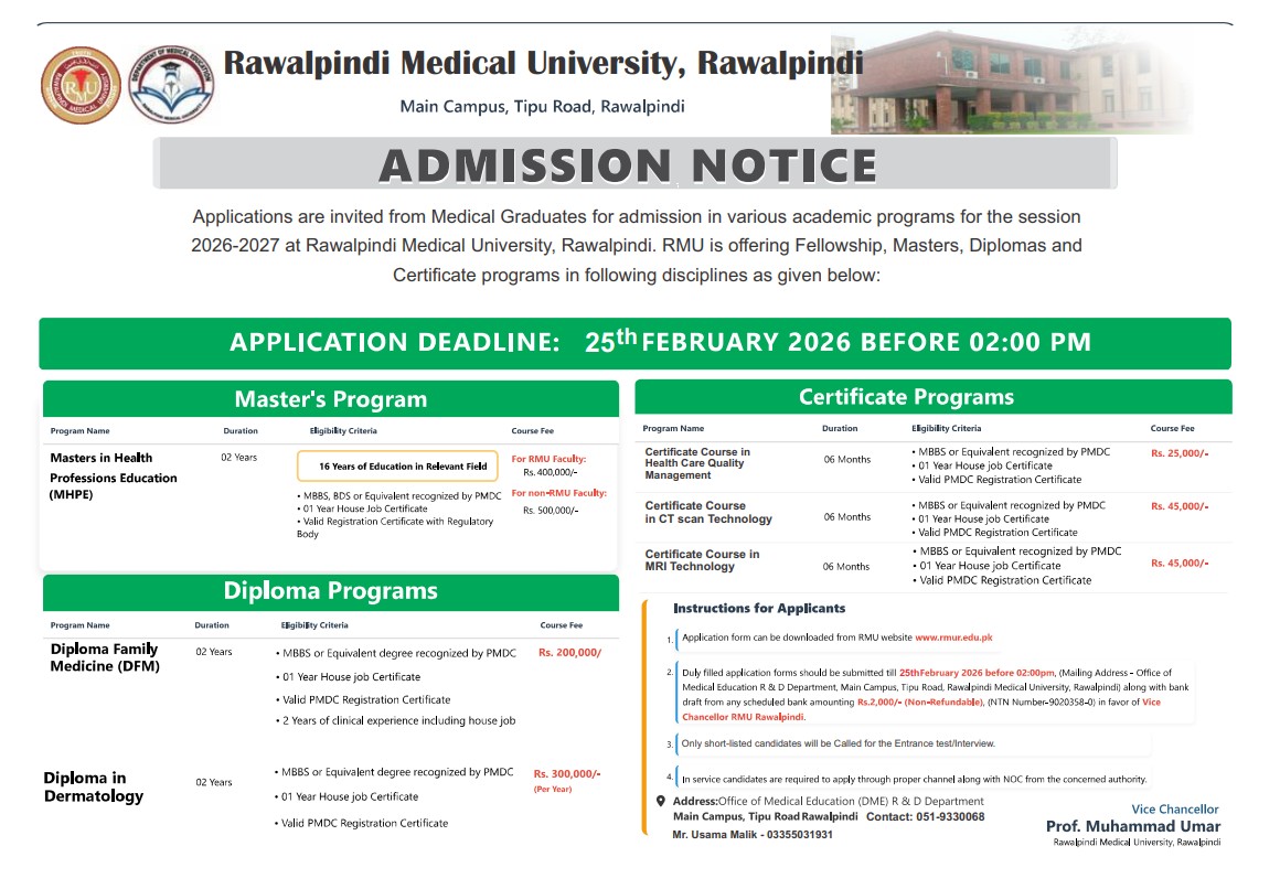 According to the notification, the RMU Rawalpindi is offering Masters in Health Professions Education MHPE with a duration of two years, along with multiple diploma and certificate programs. Applicants must hold an MBBS, BDS, or equivalent recognized degree with a valid PMDC registration certificate and a completed one-year house job. Additional eligibility criteria and experience requirements apply for specific diploma programs, including clinical experience for Diploma in Family Medicine.