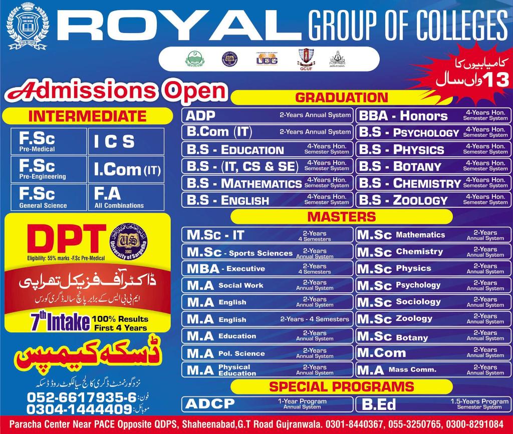 Royal Group of Colleges opens admission in Intermediate, Graduation & Masters.