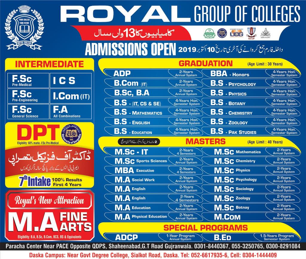 Royal Group of Colleges Gujranwala has open admissions for FA, FSc, BS in Mathematics, English, Physics, Chemistry, Education, Psychology, Botany, Zoology, BBA, BEd, ADP, B.Com, BSc, MSc in Zoology, Psychology, Chemistry, Mathematics, Sociology, Sports sciences, MA in English, Education, Social work, Physical Education. Last date for submission of admission applications is 10 Oct 2019.