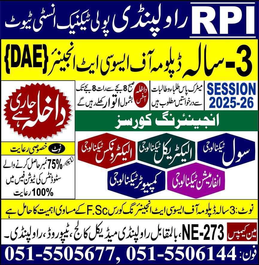 Rawalpindi Polytechnic Institute RPI, a well-reputed technical education institute, is now accepting applications for admission to its 3-year Diploma of Associate Engineer DAE programs for the academic session 2025-2026. Matric-pass students both boys and girls are encouraged to apply.