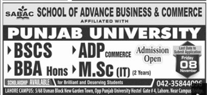 School of Advance Business & Commerce Lahore has offered admissions for BS in Computer science, ADP in Commerce, BBA, MSc in Information Technology. Last date for submission of admission application is 08 Nov 2019. Scholarships are available. Affiliated with Punjab University.