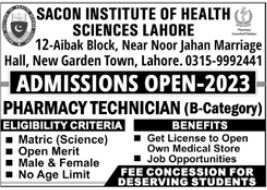 Sacon Institute of Health Sciences has recently announced admissions for the year 2023, offering a specialized program in Pharmacy Technician. Prospective students are urged to apply as soon as possible, as the admission 2023 date is approaching rapidly. This competitive program equips students with comprehensive knowledge and practical skills required in the pharmaceutical industry.