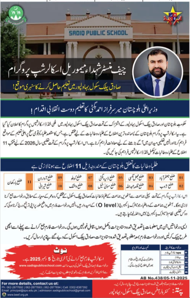 Sadiq Public School Bahawalpur, in collaboration with the Government of Balochistan, is proud to announce the Chief Minister Shaheed Memorial Scholarship Program. This fully-funded scholarship initiative, introduced under the visionary leadership of Chief Minister of Balochistan, Mir Sarfraz Ahmed Bugti, aims to provide high-quality education to students from the most underprivileged districts of Balochistan.