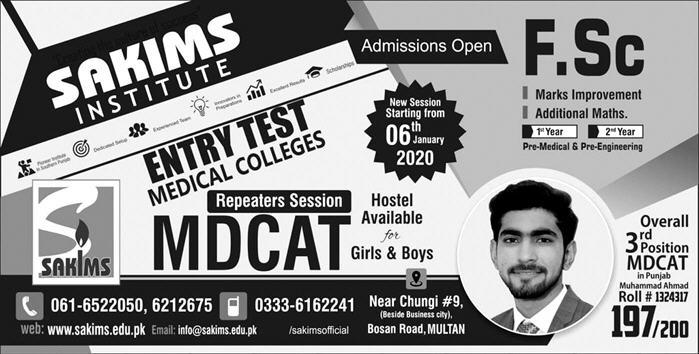 SAKIMS Institute Multan has offered admissions for FSc in Pre Medical, Pre Engineering, MDCAT Entry Test for Medical Colleges in Repeaters Session. Hostel facility are available for Boys & Girls.