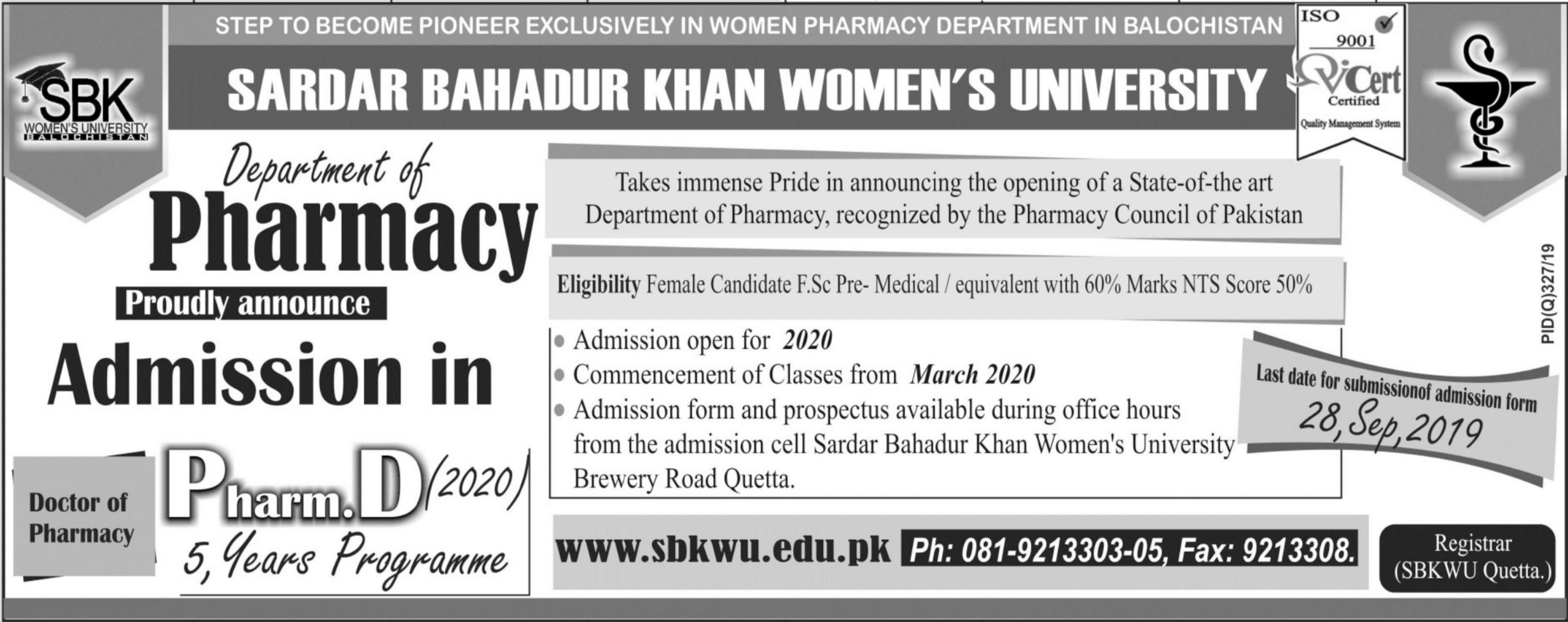 Sardar Bahadur Khan University has announced admission in Doctor of Pharmacy Pharm D in Department of Pharmacy, Quetta.