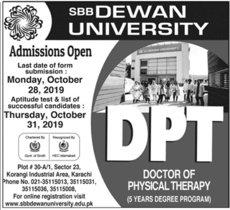 SBB Dewan University Karachi has offered admissions for DPT Doctor of Physical Therapy. 5 year Duration Program. Last date for submission of admission applications is 28 Oct 2019. Merit list will be displayed on 31 Oct 2019.