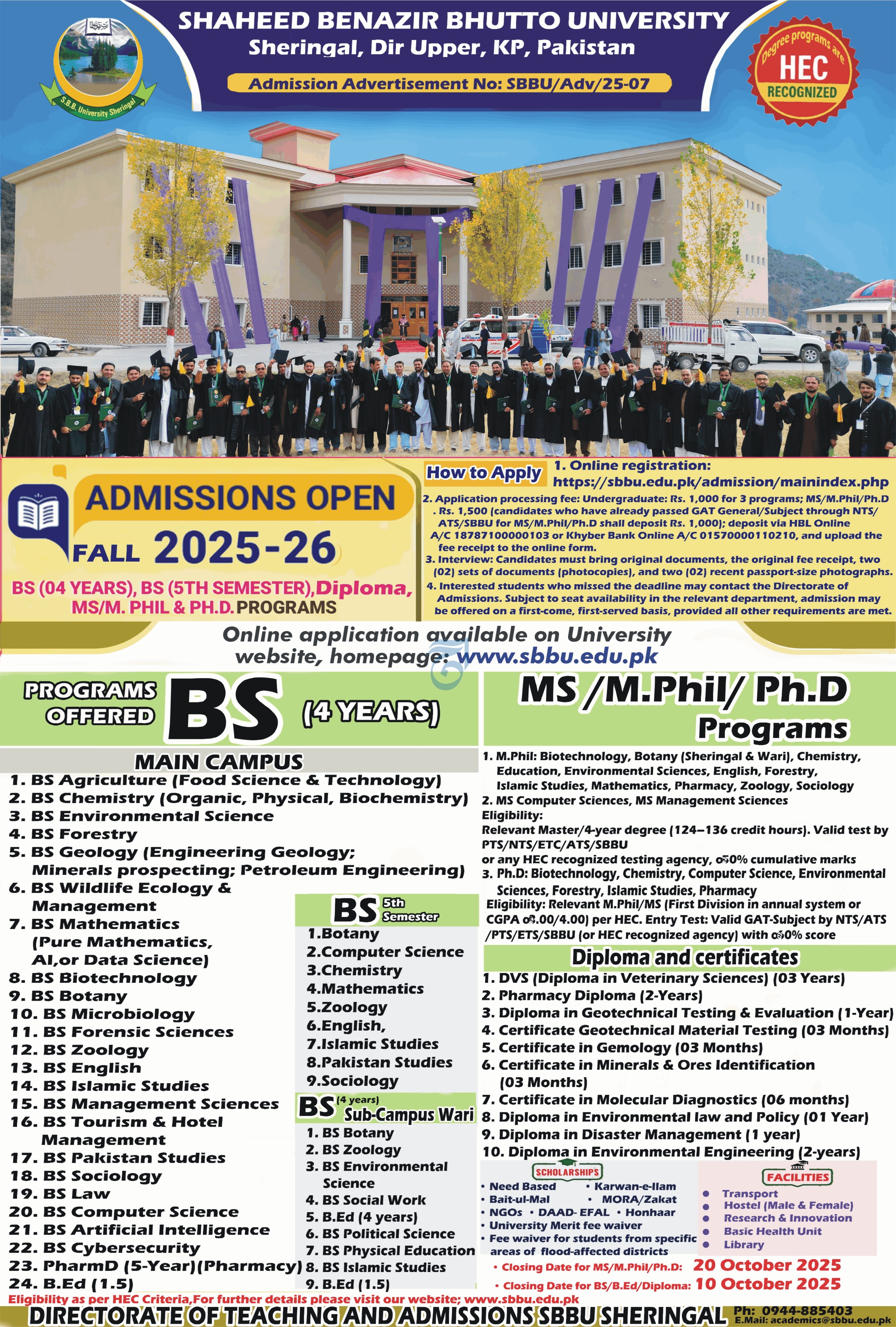 Shaheed Benazir Bhutto University SBBU, Sheringal, Dir Upper, KP, Pakistan — a HEC-recognized public sector university — invites applications for admissions in BS, MS/MPhil, PhD, Diploma and Certificate Programs for Fall 2025–26.