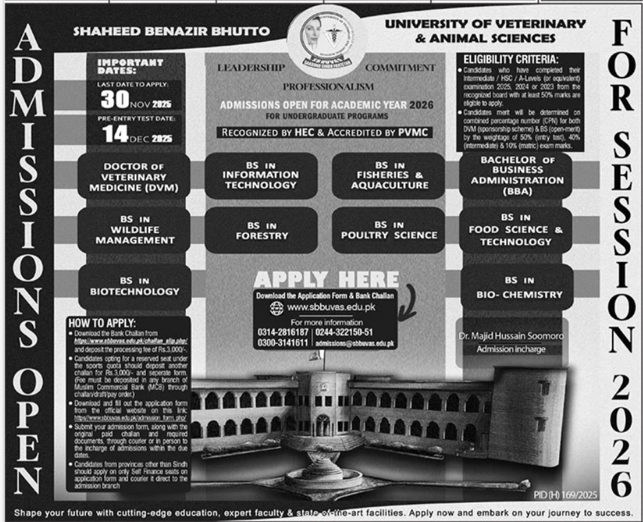 Shaheed Benazir Bhutto University of Veterinary & Animal Sciences SBBUVAS is pleased to announce that admissions are open for the academic year 2026 for undergraduate programs. The university is recognized by the Higher Education Commission HEC and accredited by the Pakistan Veterinary Medical Council PVMC, offering students a chance to pursue high-quality education in veterinary, animal sciences, biotechnology, IT, and management fields.
