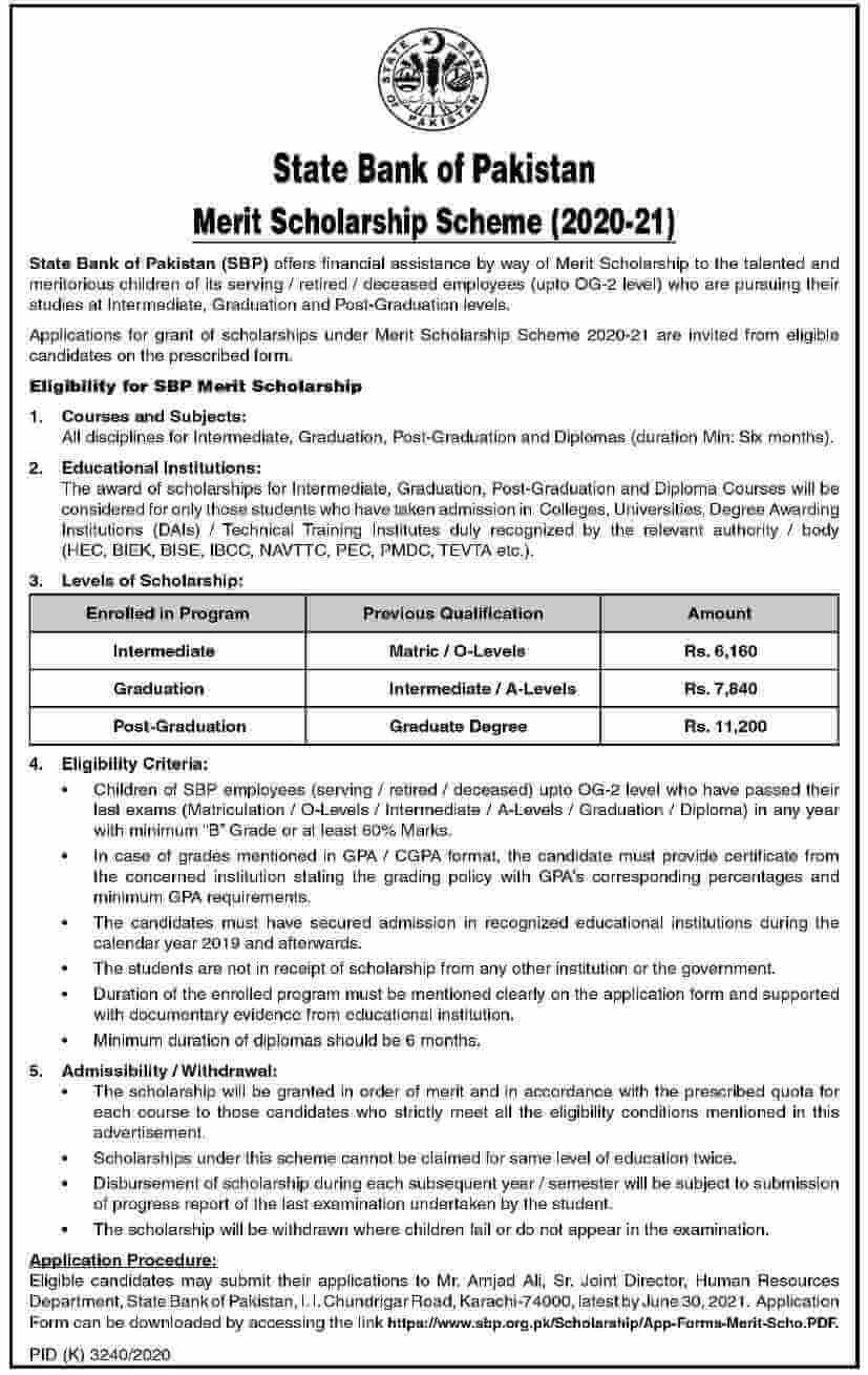 The State Bank of Pakistan is going to offer SBP Merit Scholarship 2021 for the students of Inter to master levels from all private and public schools, colleges and universities across the country. The eligible candidates can now apply to get the SBP Scholarships 2021 as per given eligibility criteria. The last date to submit the applications for Scholarships 2021 is 30-06-2021. The selection for SBP Merit Scholarships 2021 will is made purely on open merit after qualifying the test. All candidates who wish to apply can follow the instructions and schedule to Scholarships 2021.