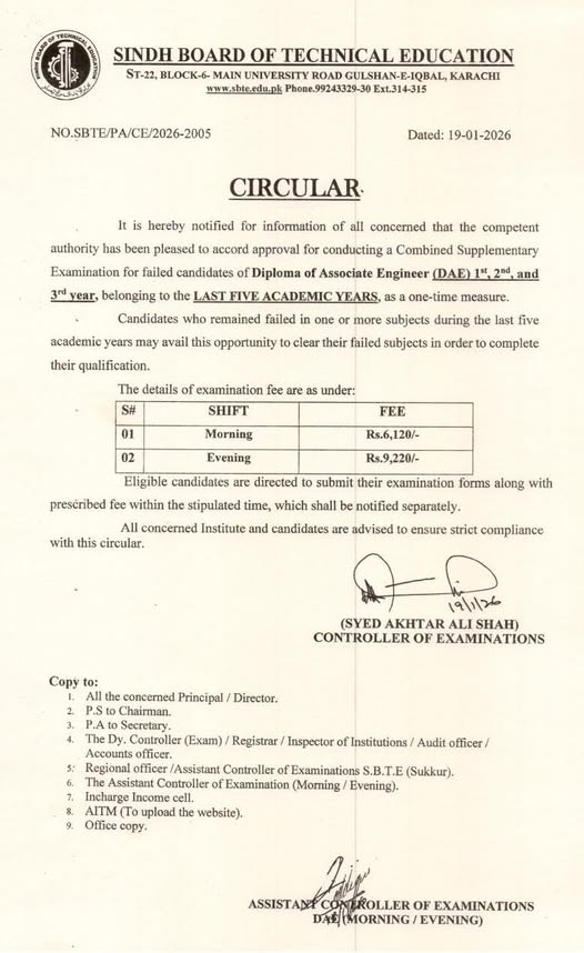 Sindh Board of Technical Education SBTE, Karachi has issued an important circular regarding the approval for conducting a Combined Supplementary Exams for candidates who have failed in the Diploma of Associate Engineer DAE 1st, 2nd, and 3rd year. This measure applies to failures from the last five academic years and is being offered as a one-time opportunity. The students can get the latest updates of SBTE Announces Combined Supply Exams for DAE Students.