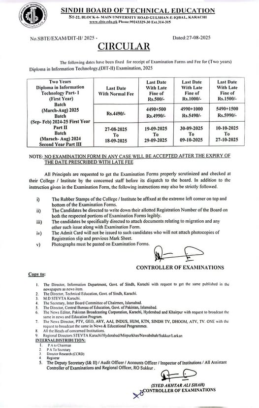 Karachi, the Sindh Board of Technical Education SBTE has issued an official circular regarding the Diploma in Information Technology DIT-II Examination 2025. Students enrolled in Part-I, Part-II, and Part-III are advised to submit their examination forms and fees within the announced deadlines to avoid late charges.