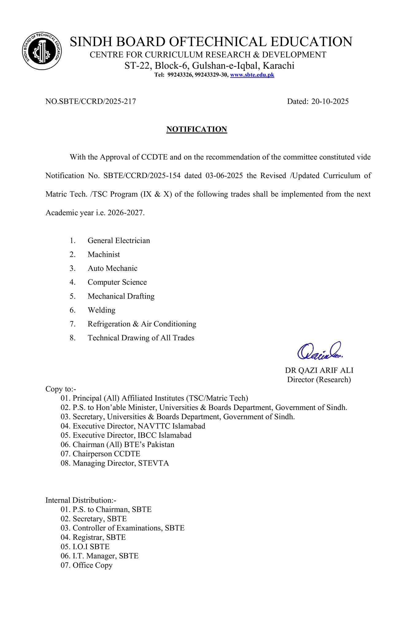 Karachi, The Sindh Board of Technical Education SBTE has officially approved the Revised and Updated Curriculum for Matric Tech & TSC Programs for Classes IX and X.
