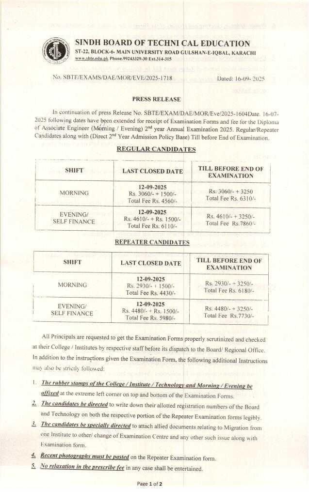 All regular and repeater students of the morning and evening session has the last date for the submission of the admission forms with normal fee was 12-09-2025 but the candidates have another chance to forward their forms and fee till before finishing of the exams. The candidates will read the instructions of the SBTE, which are critical to follow them at the time of sending their forms and payment of fee.
