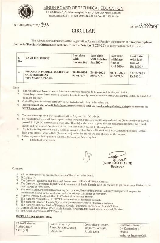 Karachi, Sindh Board of Technical Education is going to start the exams process for the two years diploma course in “Paediatric Critical Care Technician” for the session 2025-26. The candidates can get the latest updates of SBTE Diploma of Paediatric Critical Care Technician 2025 Forms Schedule. The candidates will note the dates on which they will submit their application forms and deposit the fee so that they can be able to appear in the next coming exams.