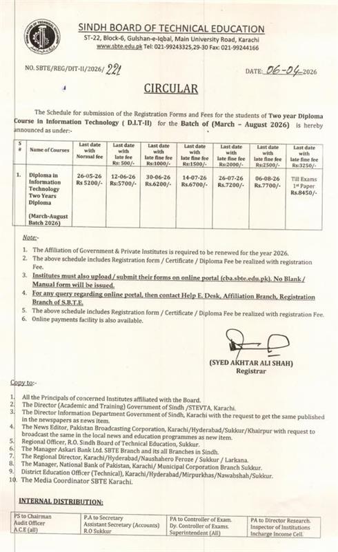 The SBTE DIT Registration 2026 schedule was officially released on April 6, 2026, by the Sindh Board of Technical Education for the March-August batch. This mandatory registration process applies to all students enrolled in the two-year Diploma in Information Technology D.I.T-II across affiliated institutes in Sindh. Ensuring timely submission of forms and fees is crucial for academic eligibility in the upcoming examination cycle.