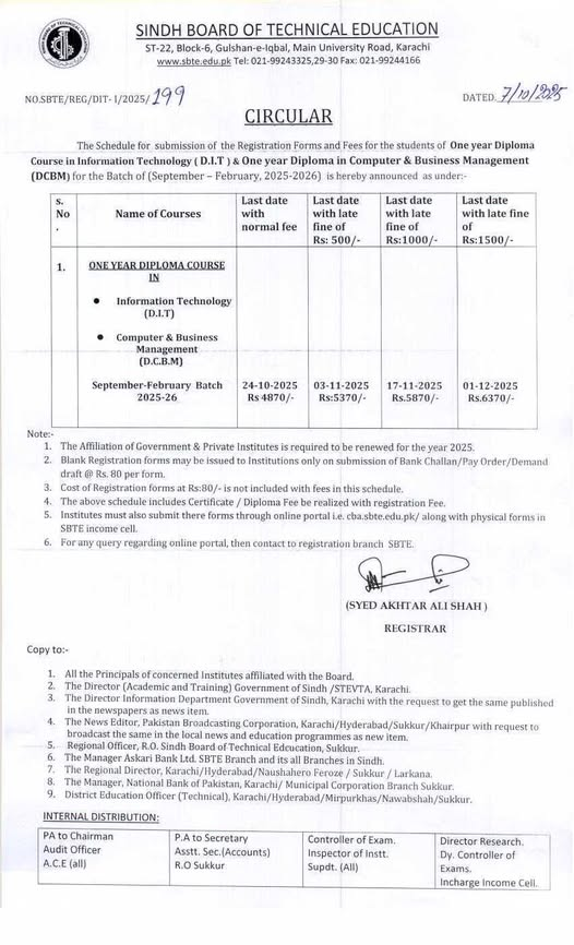 Karachi, Sindh Board of Technical Education Karachi is going to carry out the registration of the newly admitted candidates in the one year diploma course in Information Technology and Diploma in Computer and Business Management for the academic year 2025-26. The candidates are advised to forward their application forms for their registration with the technical education board under SBTE Karachi DIT & DCBM Registration Forms Schedule 2025-26.