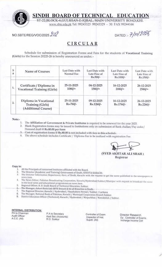 Karachi, Sindh Board of Technical Education SBTE Karachi has released the registration schedule for newly admitted students in the Diploma/Certificate in Vocational Training Girls program for the academic session 2025-26. All fresh students are instructed to submit their registration forms to the technical education board according to the announced SBTE Karachi Vocational Training Girls Registration Forms Schedule 2025-26. The students can check the detailed information of SBTE Karachi Vocational Training Girls Registration Schedule 2025-26.