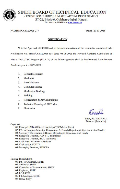 Sindh Board of Technical Education Karachi has revised the curriculum of the matric and TSC programs in the trades including General Electrician, Machinist, Mechanical Drafting, Auto Mechanic, Computer Science, Electronics, Welding, Refrigeration & Air Conditioning and Technical Drawing of all Trades. The students can get the latest updates of their SBTE Matric Tech / TSC 2026-27 Revised Curriculum. This curriculum is issued after the approval of the CCDTE and the recommendation of the committee.