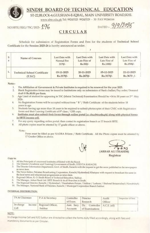 Karachi, Sindh Board of Technical Education is going to start the exams process for the Technical School Certificate for the session 2025-26. The candidates can get the latest updates of SBTE TSC Annual Exams 2025 Forms Schedule. The candidates will note the dates on which they will submit their application forms and deposit the fee so that they can be able to appear in the next coming exams.