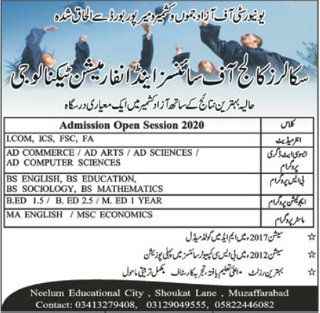 Scholars College of Science & Information Technology is offering admissions 2020 in ICOM, ICS, FSc, FA, AD Commerce, AD Arts AD Sciences, AD Computer Science, BS English, BS Education, BS Sociology, BS Mathematics, B.Ed, MA English, M.Sc Economics in Muzaffarabad.