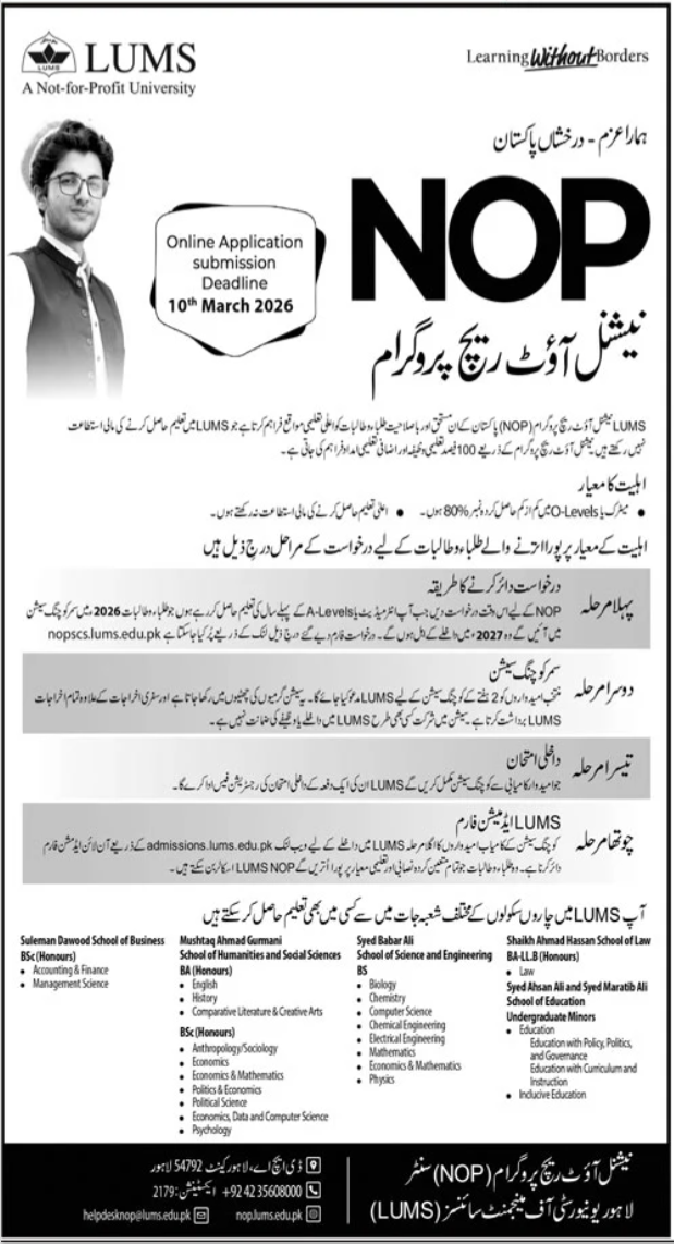 Lahore University of Management Sciences LUMS, one of Pakistan’s leading not-for-profit universities, has announced applications for its National Outreach Program NOP for 2026. This initiative aims to provide highly talented but financially deserving students from across Pakistan with the opportunity to study at LUMS through fully funded scholarships.