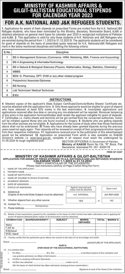 Ministry of Kashmir Affairs and Gilgit Baltistan is pleased to announce educational stipends for students from Azad Kashmir, Jammu, and Kashmir refugees. This scholarship aims to support deserving students in pursuing higher education in recognized institutions across Pakistan and AJ&K for the calendar year 2023. The students can get the latest updates of Scholarship Opportunity for Kashmiri Students.