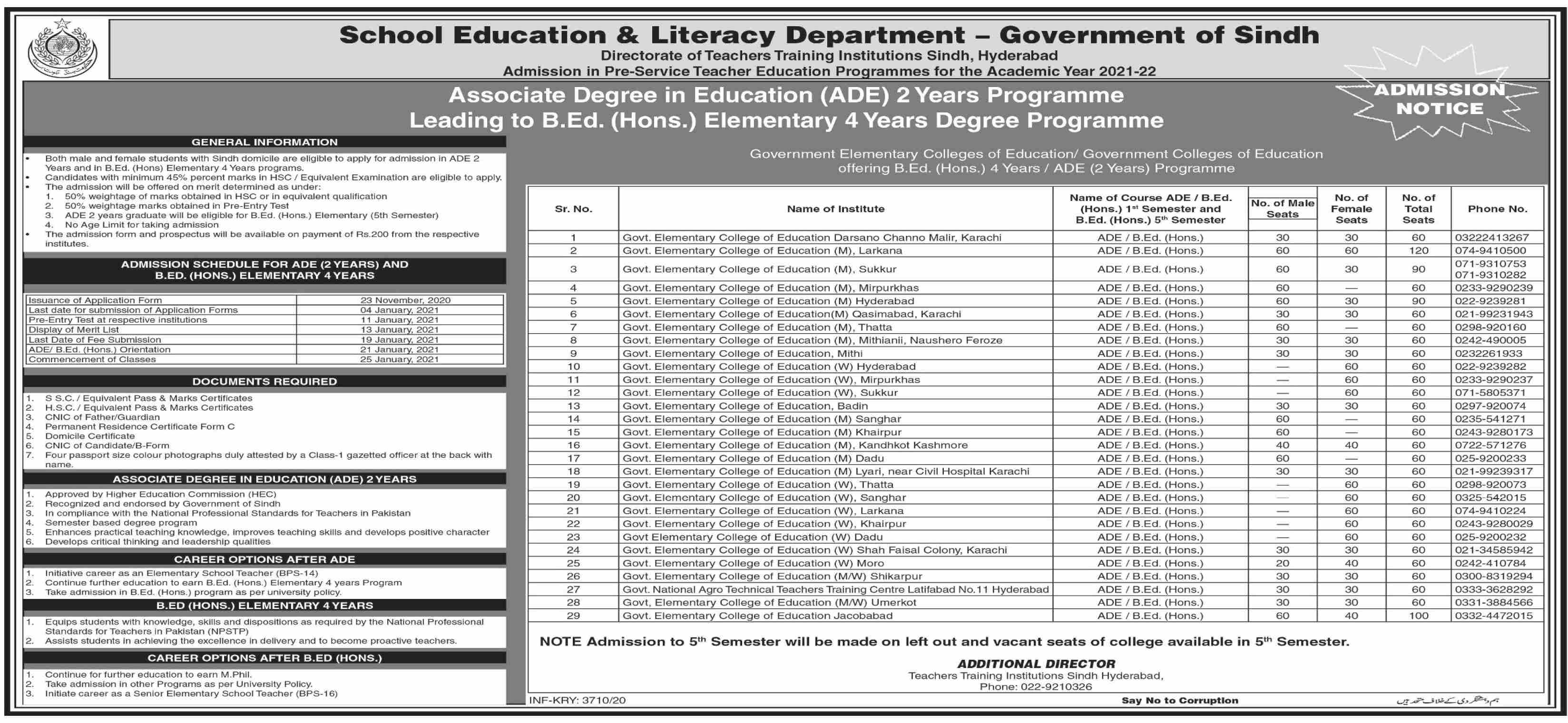 School Education & Literacy Department Government of Sindh has announced admissions for Associate Degree in Education Leading to BEd Hons Elementary in different colleges of Hyderabad. Last date for submission of admission applications is 04 Jan 2021. Commencement of classes will be on 25 Jan 2021. Admissions are open.