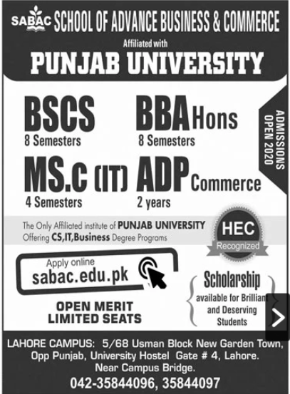 School of Advance Business & Commerce SABAC has announced admissions 2020 in BS Computer Science, BSCS, BBA, MSc Information Technology, ADP Commerce in Lahore, School of Advance Business & Commerce is affiliated with Punjab University.