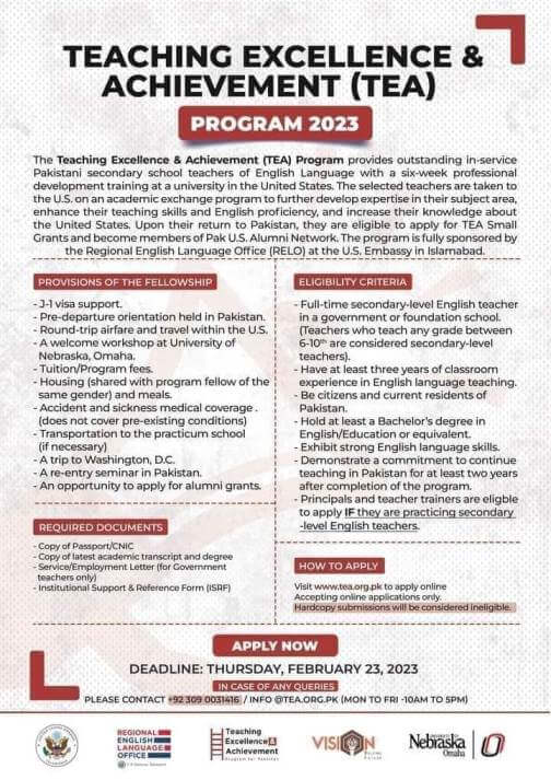 The University of Nebraska at Omaha, U.S. Embassy, in cooperation along with Vision-Building Future and Regional English Language Office RELO Pakistan, are glade to declare Teaching Excellence and Achievement TEA Program Pakistan 2023. TEA gives excellent assistance to the Secondary school English language Pakistani teachers with a six week educational program at a university in the United State of America.