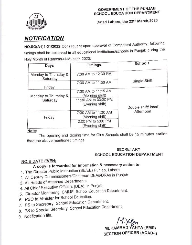 Lahore, School Education Department, Government of the Punjab has announced the timings of the schools and colleges located in Punjab province during the holy month of Ramazan. SED has issued the notification and the following timings will be observed in all schools and colleges across Punjab. The students will watch the complete information of Punjab Schools Timings during Ramazan.