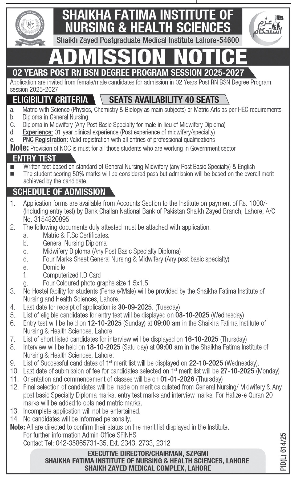 The Shaikha Fatima Institute of Nursing & Health Sciences SFINHS, a part of the prestigious Shaikh Zayed Postgraduate Medical Institute, Lahore, is pleased to announce admissions for the 02-year Post RN BSN Degree Program for the session 2025-2027. Applications are invited from eligible male and female candidates who wish to advance their professional nursing education and skills.