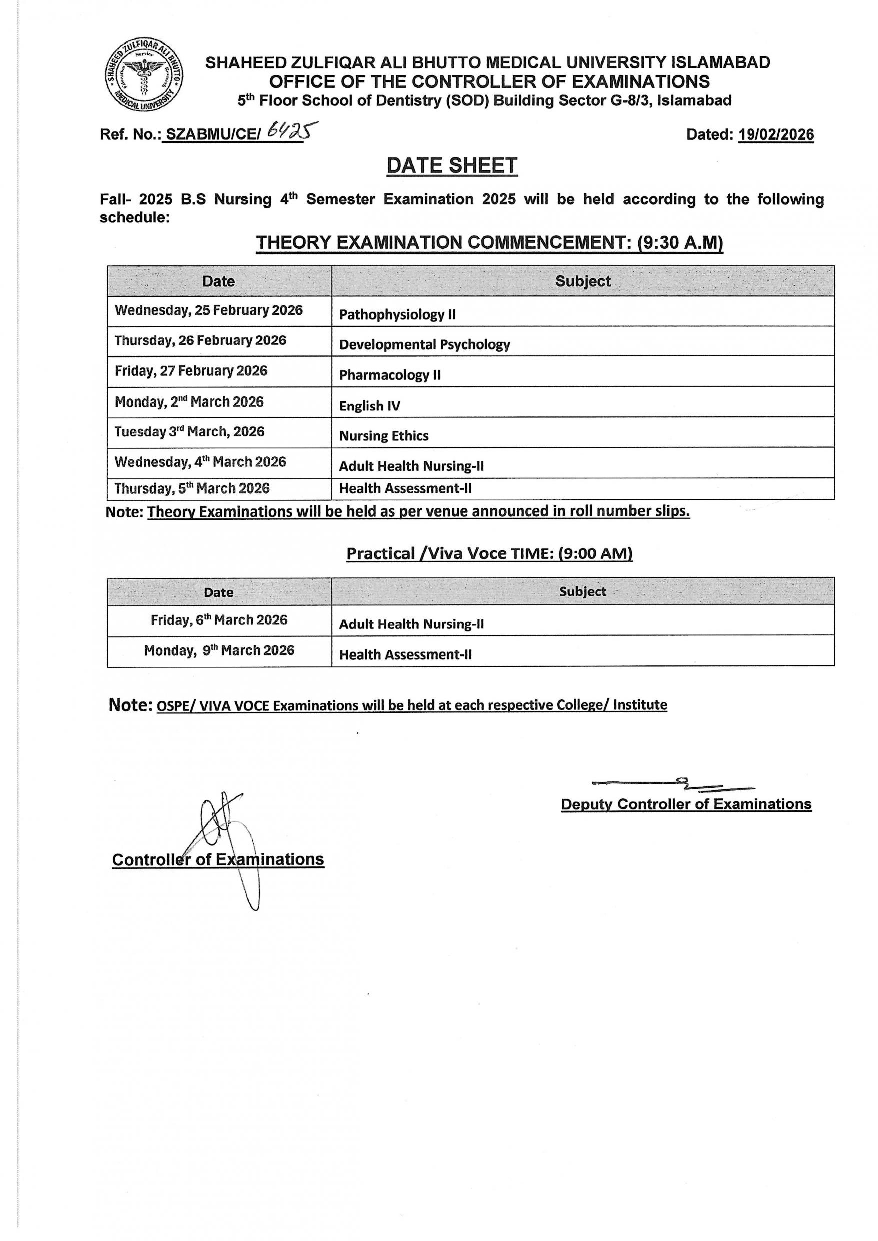 An important academic update has been released as Shaheed Zulfiqar Ali Bhutto Medical University Islamabad has officially issued the Datesheet for Fall 2025 Nursing 4th Semester Examination 2025 scheduled for 2026. The announcement has brought clarity to nursing students who were eagerly searching for the SZABMU Nursing 4th Semester datesheet 2026 and Fall 2025 nursing exam schedule.