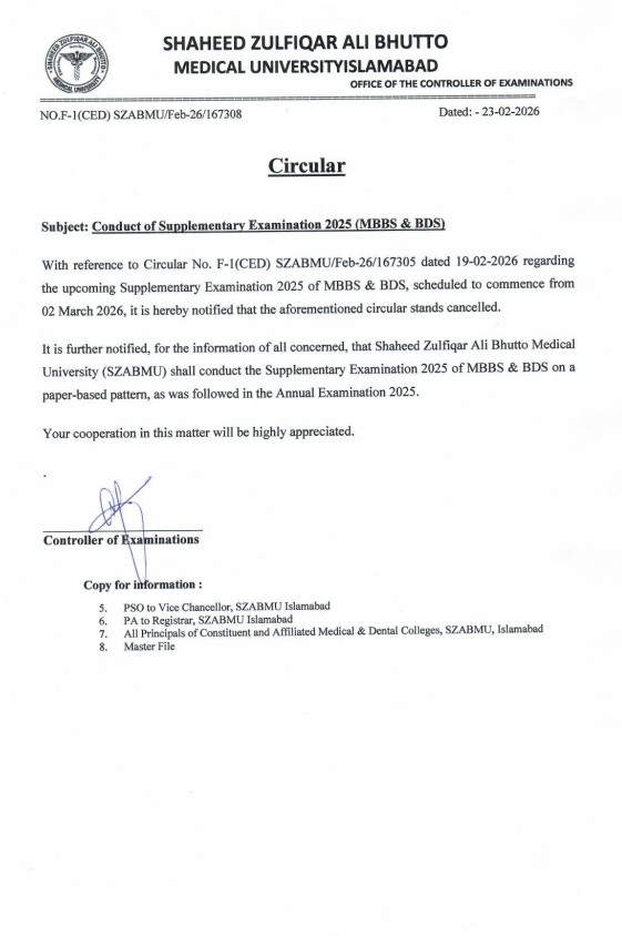 Shaheed Zulfiqar Ali Bhutto Medical University Supplementary Exam 2026 Update