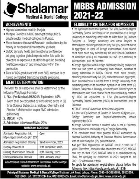 Shalamar School of AHS Lahore MBBS Admissions 2021-22